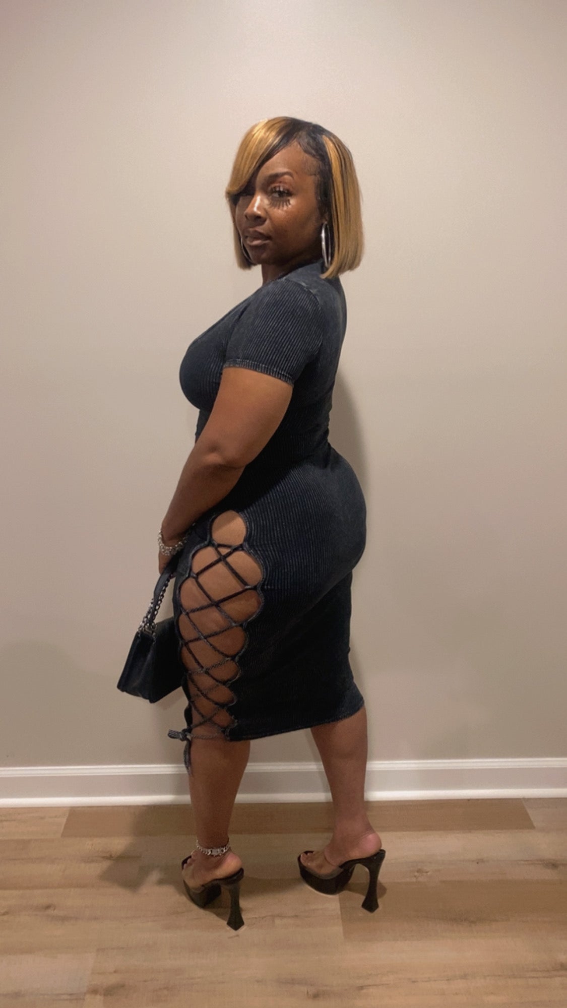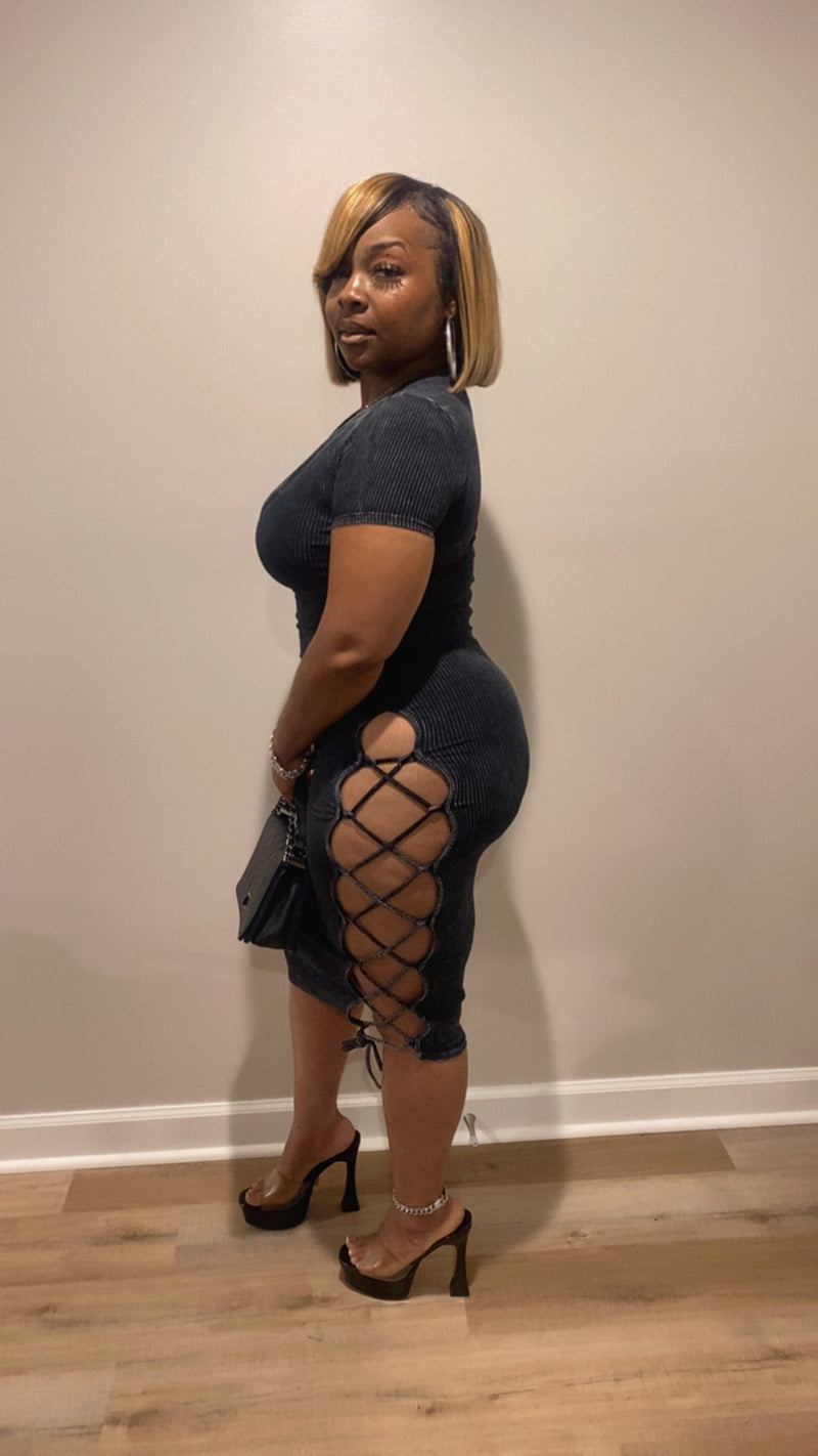 Our “Peekaboo Dress” Features: Great stretch, vneck, peekaboo side design, adjustable side string, no closure.