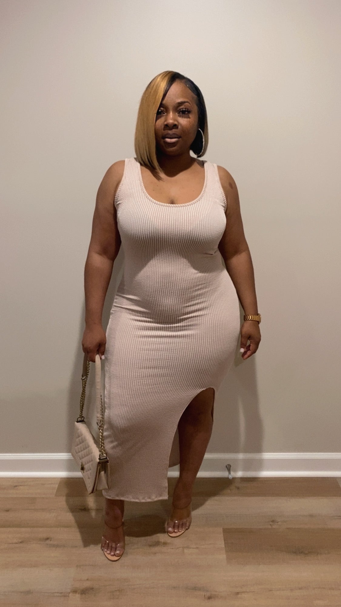Our “Spring It Dress” Features: Great stretch, sleeveless, scoop neck, ribbed side slit, no closures.