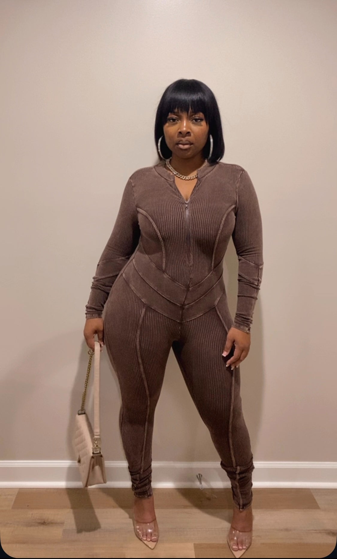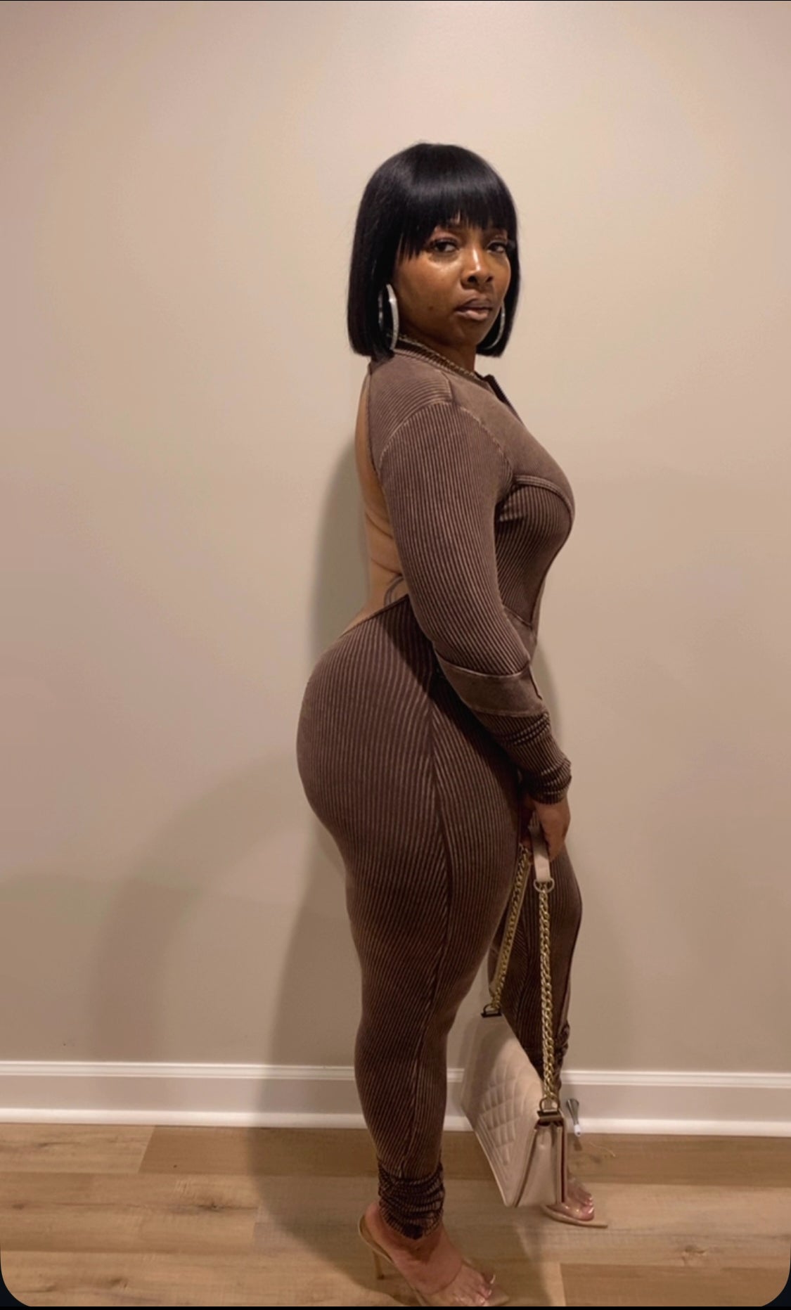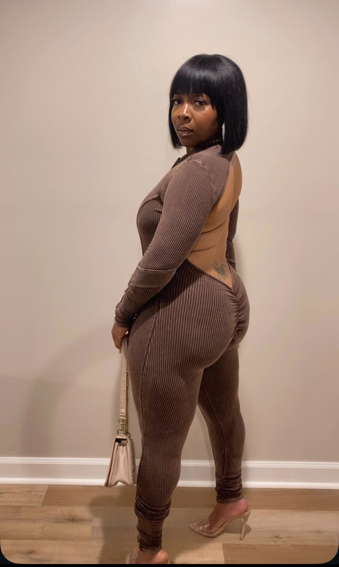 Our “Open Back Jumpsuit” Features: Great stretch, long sleeve, open back, scrunch design. Zipper closure