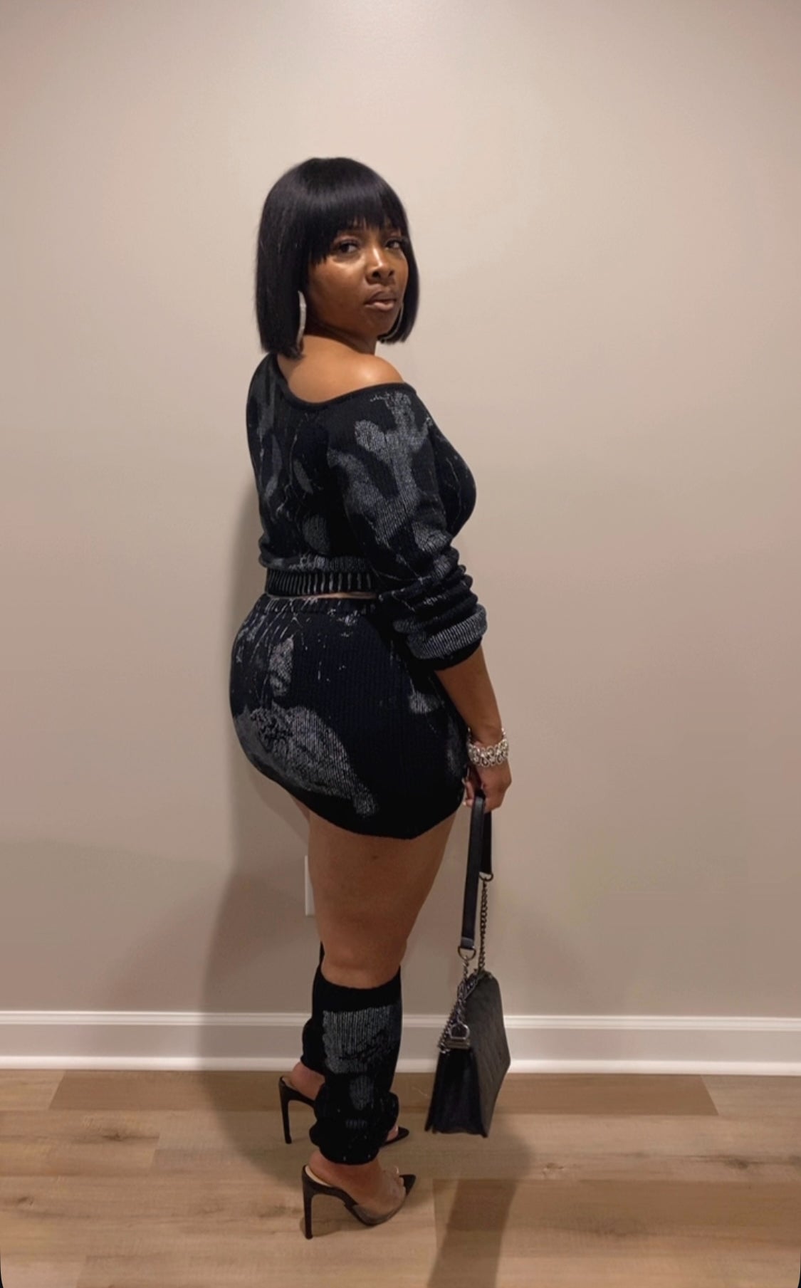 Our “3 Piece Knit” Features: Off shoulder knit top, knit skirt, knit leg warmers. No closure  60% Cotton  40% Acrylic  Model is wearing a size: Medium