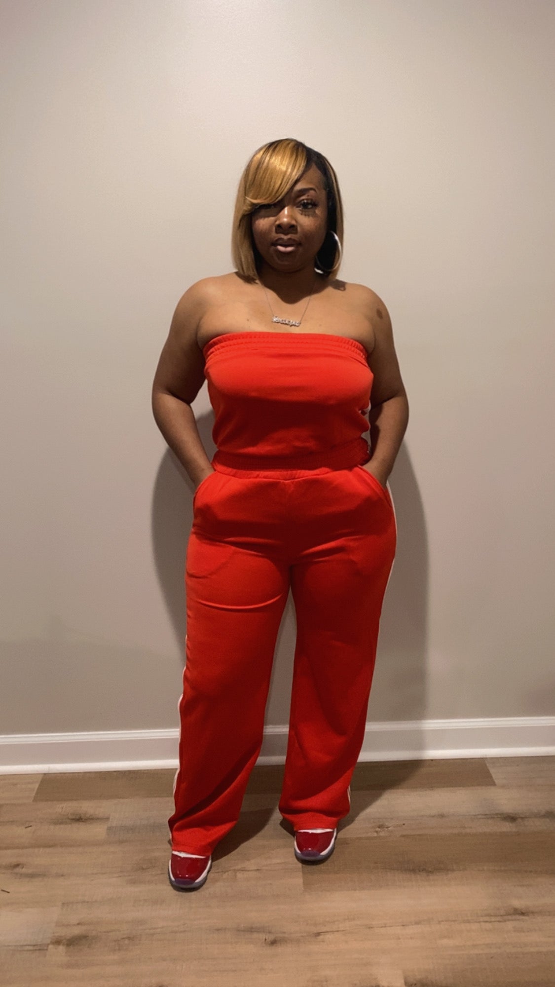 Our “Swaggy Tube Jumpsuit” Features: Great Stretch, one piece, pockets with no closure.