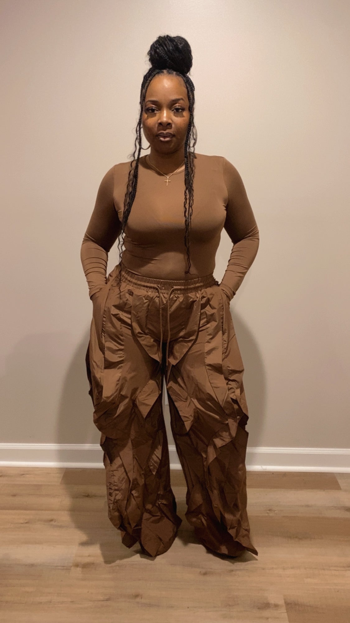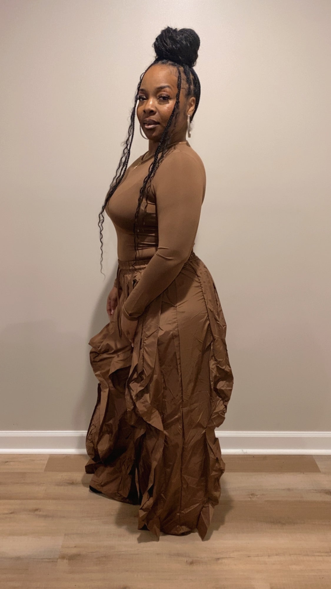 Our “Swing My Way Set” Features: Good stretch bodysuit windbreaker pants with elastic waist drawstring bottom no closure.