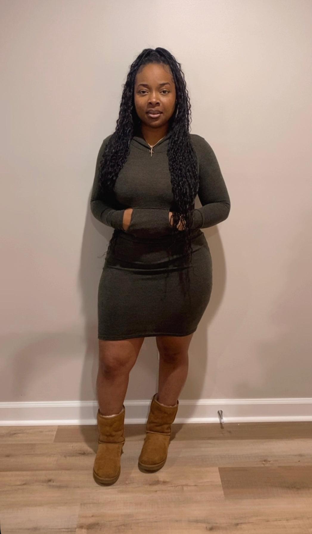 Our “Hoodie Chill Dress” Features: Good Stretch, hoodie dress, front pockets, no closure.