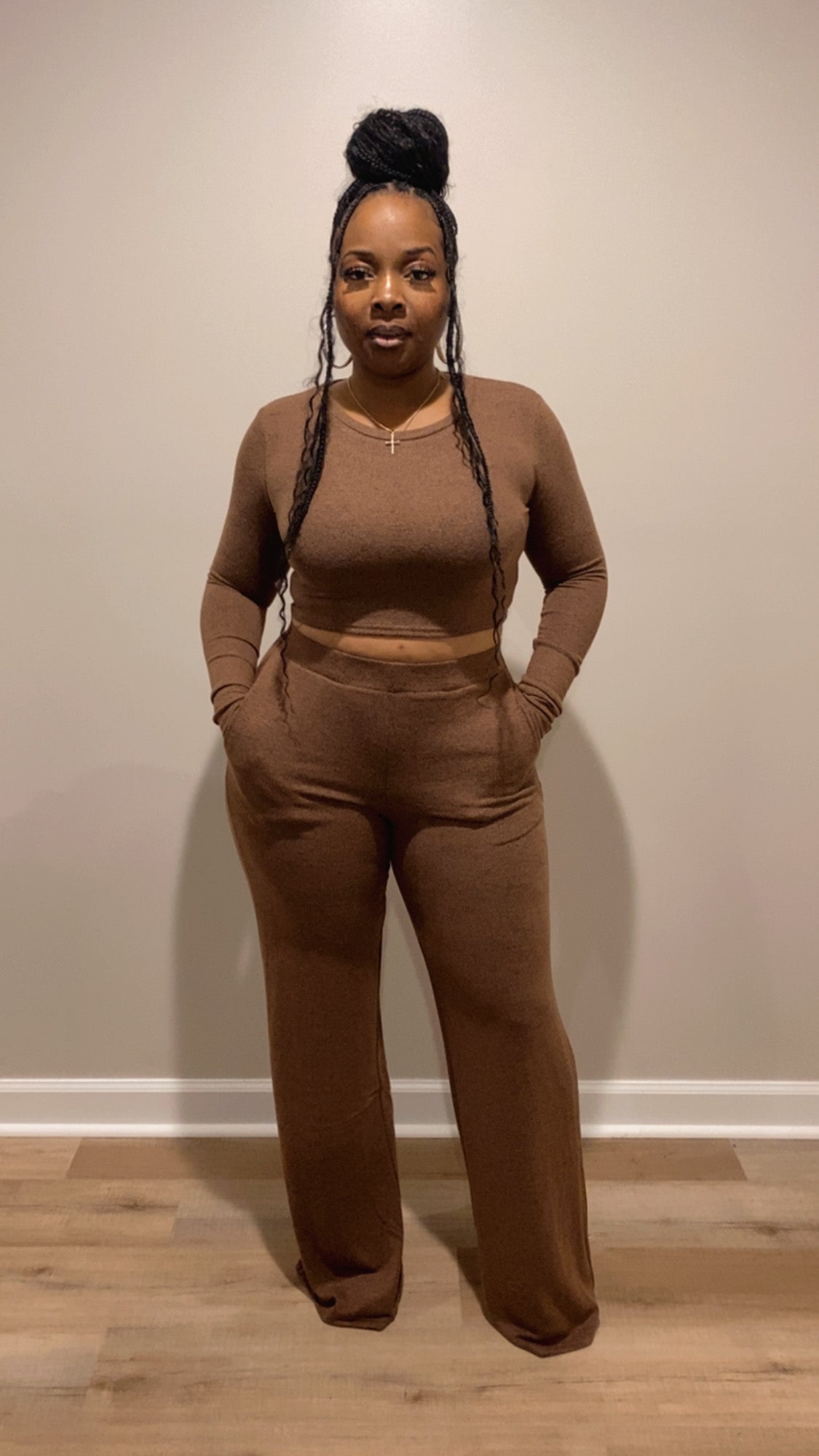 Our “RiRi Set” Features: Great stretch, long sleeve crop top, high waist pants with elastic waist and pockets no closure.
