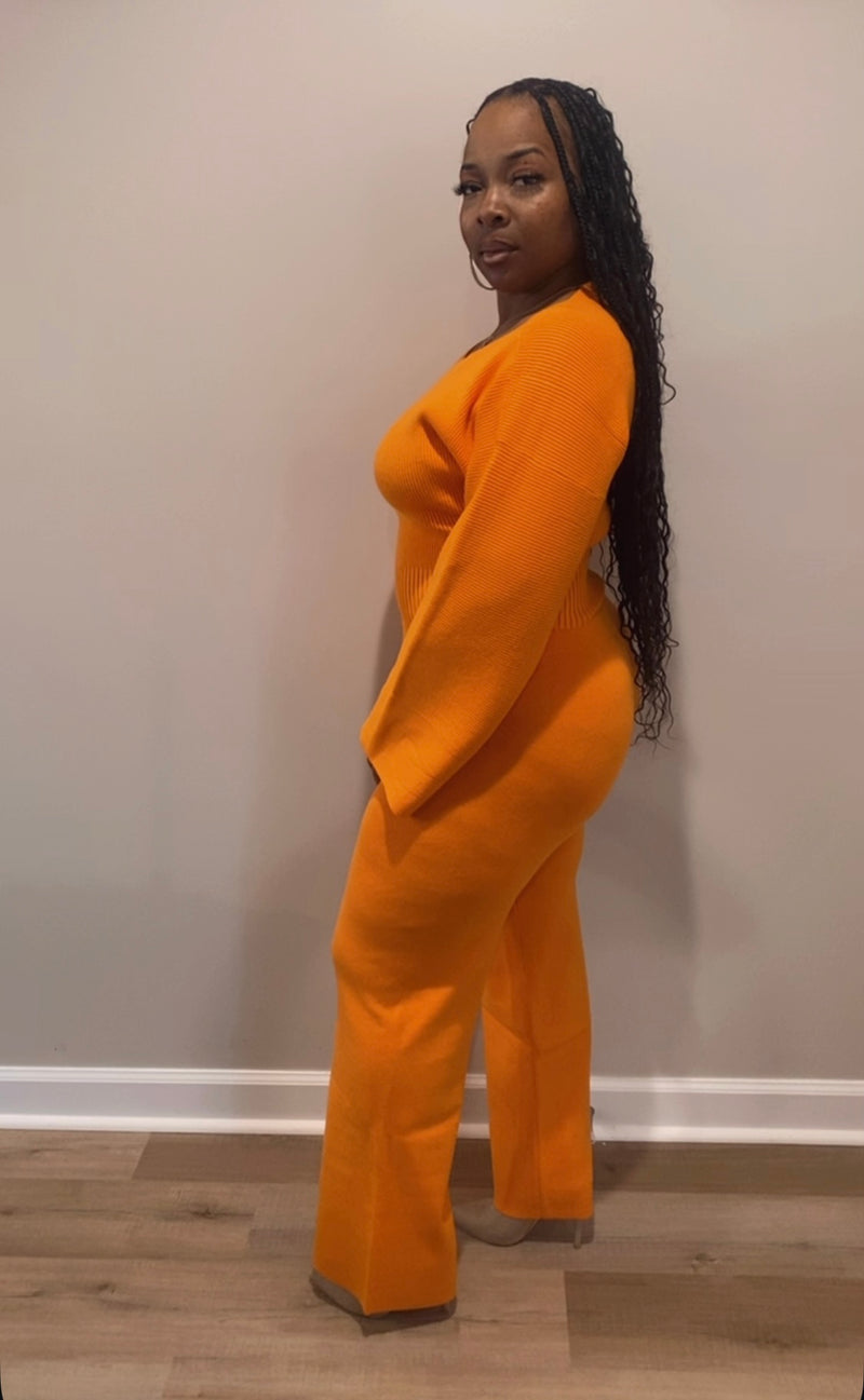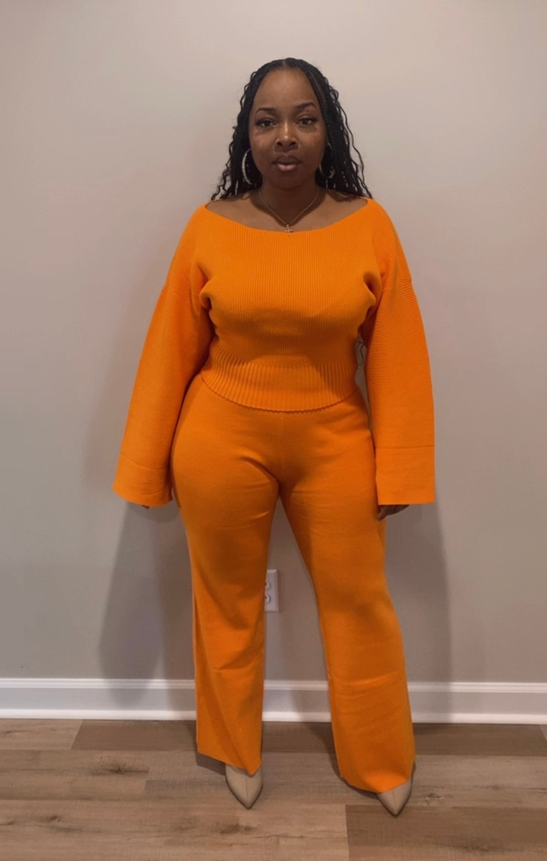 Our “Sunny Set” Features: Great stretch, on or off shoulder top with long bell sleeves, Elastic waist pants with no closure.